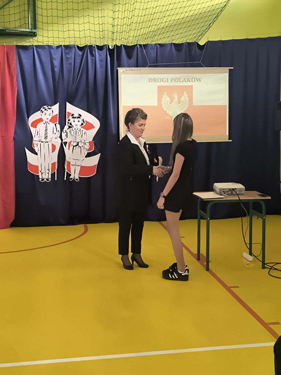 Nastąpiło również rozstrzygnięcie szkolnego konkursu historycznego na prezentację multimedialną pt. „Drogi Polaków do Niepodległości”. Dyplomy zwycięzcom wręczyła pani wicedyrektor Edyta Cuper. III miejsce zajął Marcel Rylski, II Katarzyna Jasiczek, a zdobywczynią I miejsca została Wiktoria Piłat, która zaprezentowała swoją pracę podczas apelu.