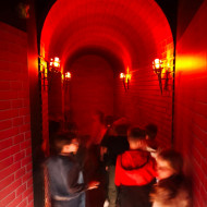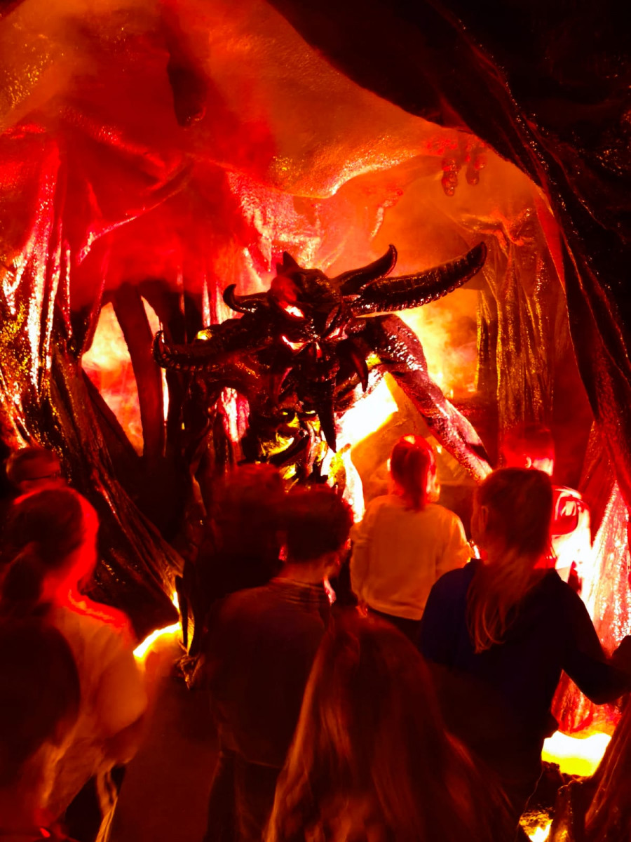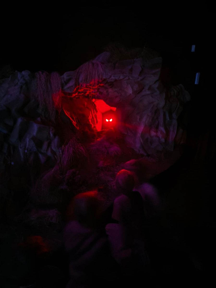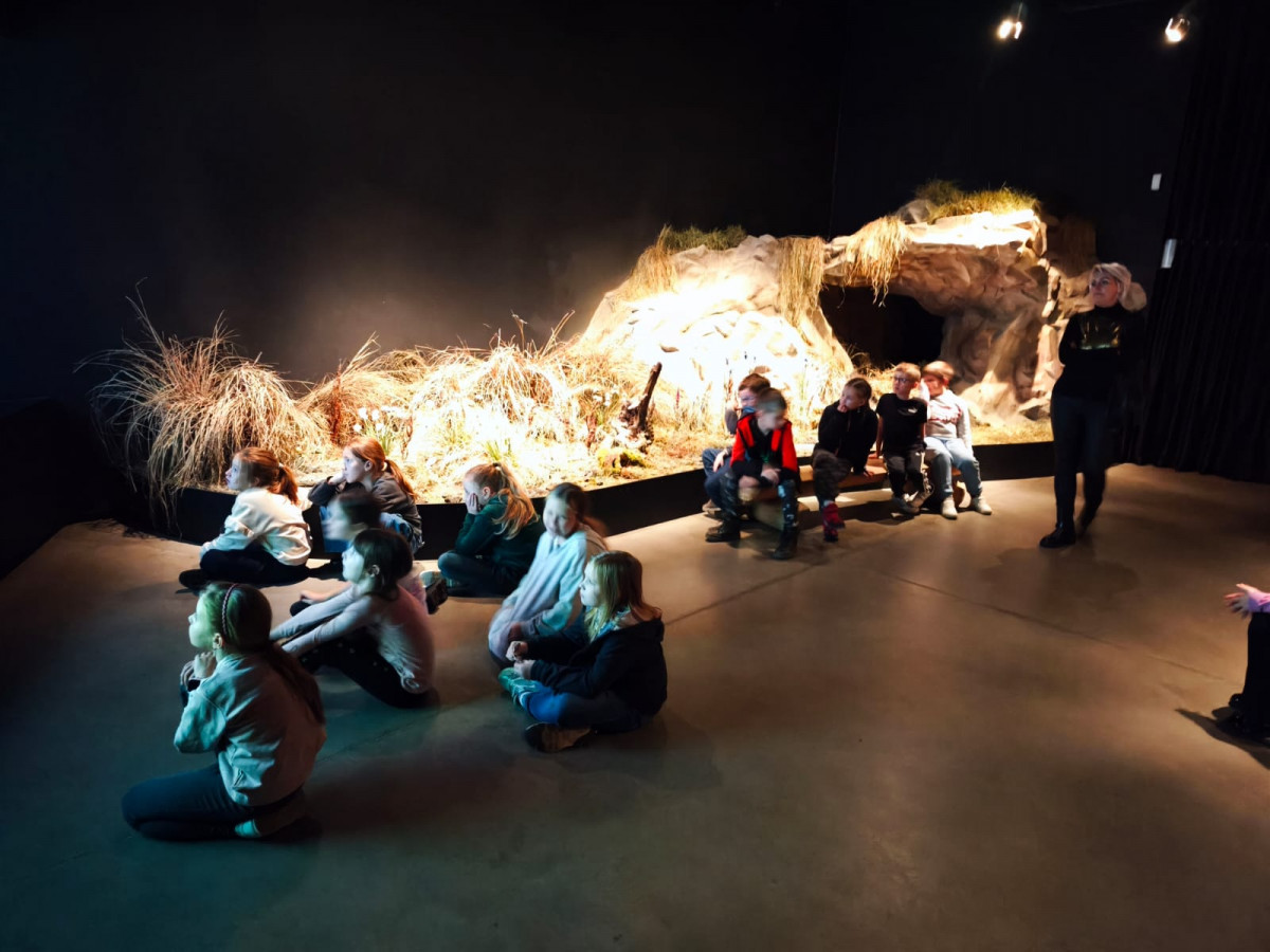 Powitani przez (podejrzanie uśmiechniętą) przemiłą obsługę, pozostawili swoje rzeczy w szatni i ruszyli w nieznany świat świętokrzyskich legend. W ciemnych korytarzach szli wiedzeni światłem zapalanych kolejno lamp, co jakiś czas, słychać było głębokie westchnienia i krzyki zwiedzających. Legendy nie były opowiadane przez przewodnika. Swoimi głosami dawni mieszkańcy opowiadali własną historię. Uczniowie słuchali i oglądali z zaciekawieniem tajemnicze miejsca. Głosy rycerzy, śmiech czarownic, łomot głazów rzucanych przez olbrzymy, walki zbójców z bogaczami, historia pielgrzyma – przepowiadająca nadejście końca świata, zawiłe opowieści o królach i królowych, oraz ryk strasznego stwora. To wszystko doprowadziło naszych milusińskich do…