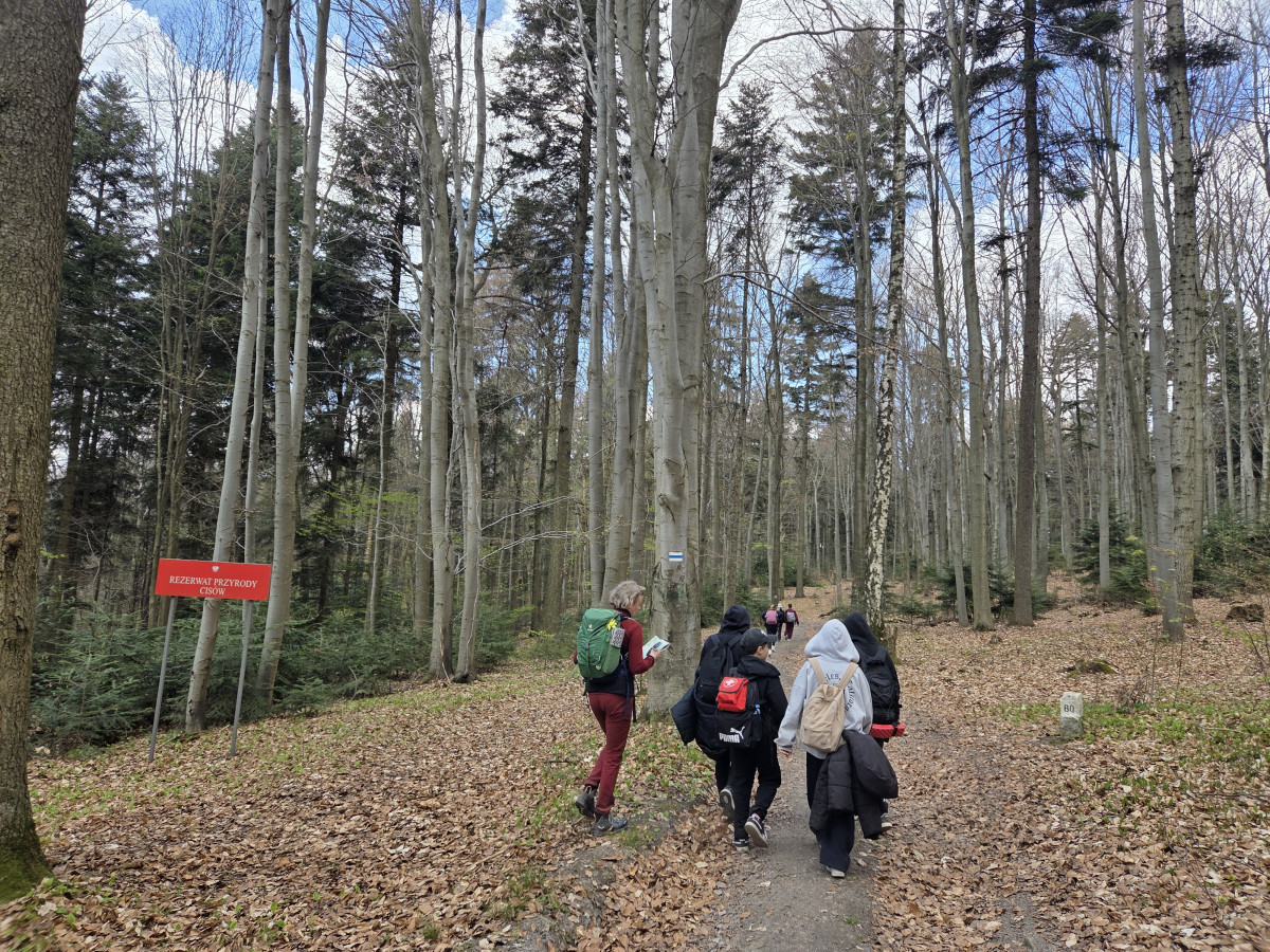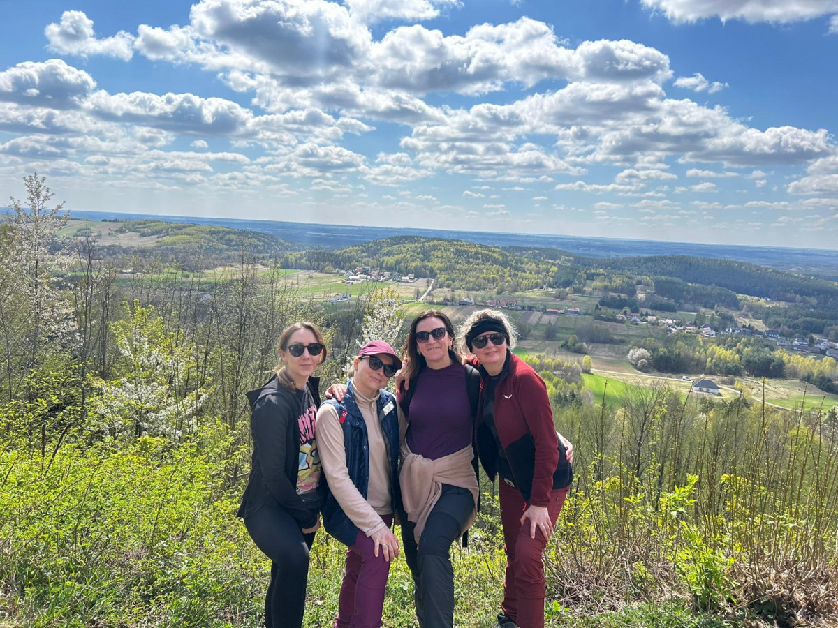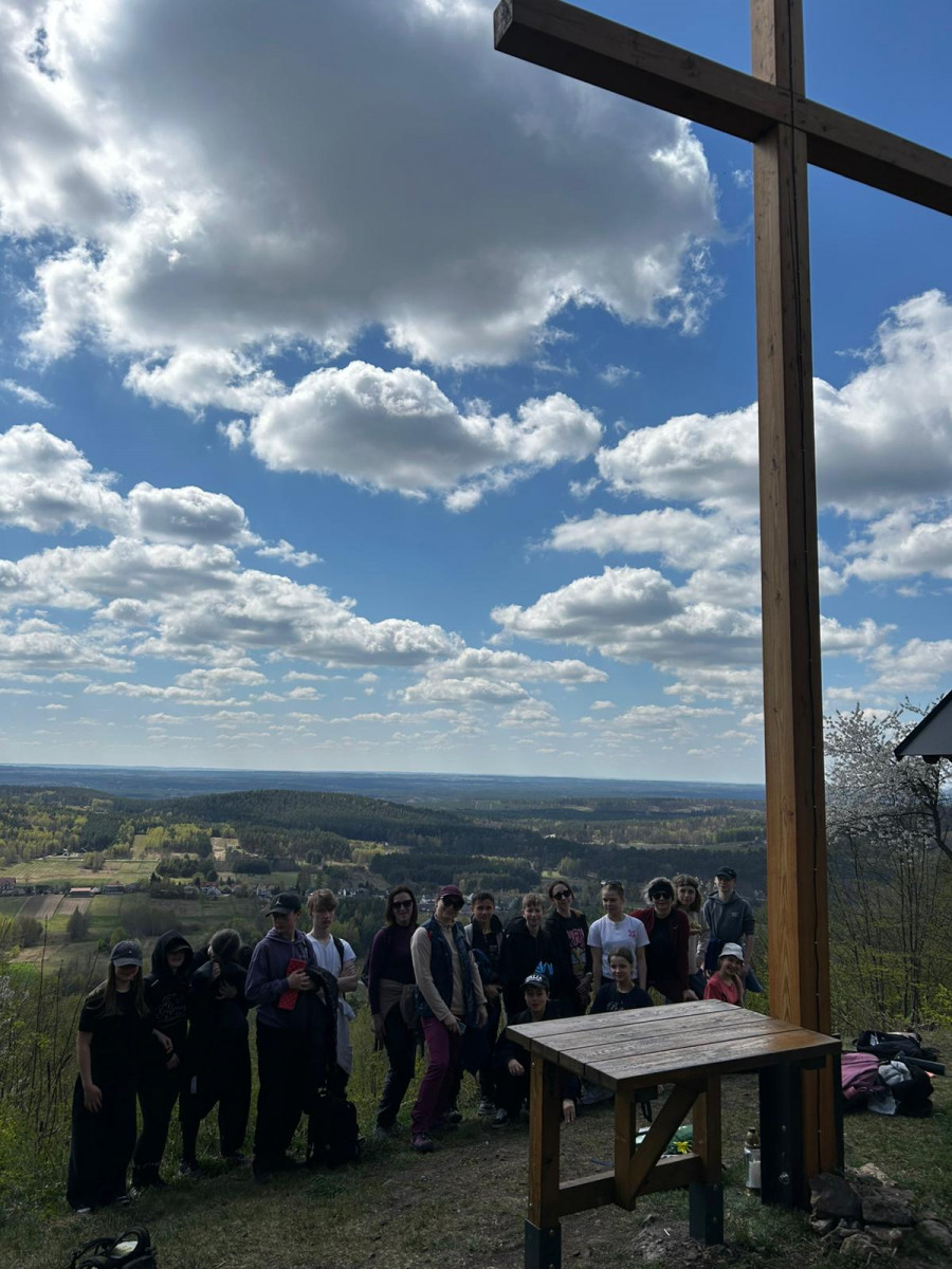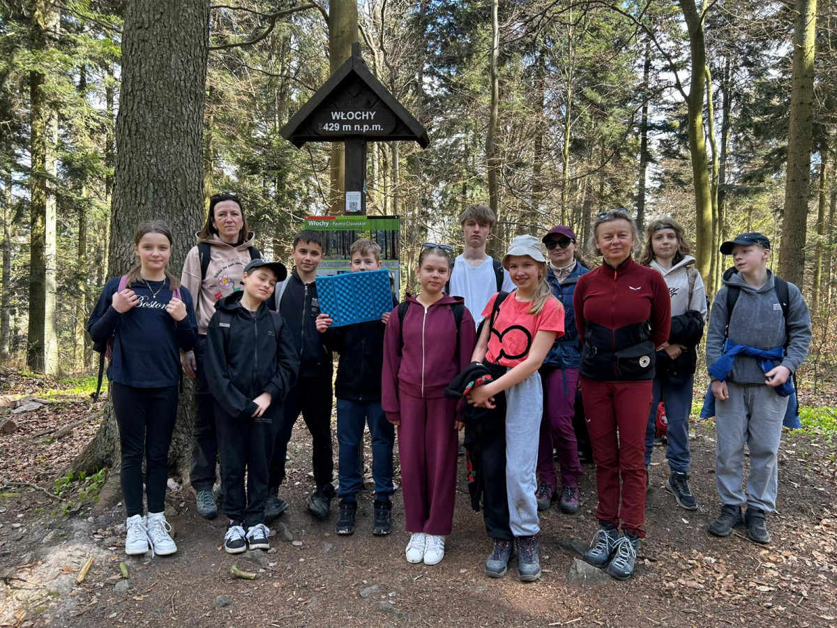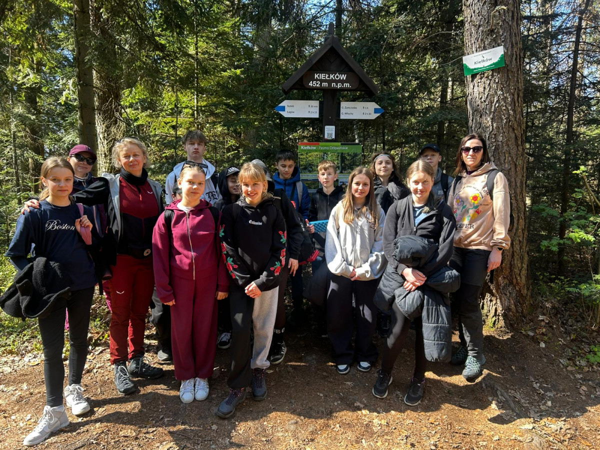 18 kwietnia „Włóczykij SP 5” w godzinach porannych wyruszył na wiosenny rajd na trasie Łagów – Daleszyce ok. 26 km. Naszą przygodę rozpoczęliśmy wędrując niebieskim szlakiem turystycznym im. Edmunda Padechowicza z rynku w Łagowie. Pierwszym zdobytym przez nas szczytem był Kiełków 427 m n.p.m., należący do Korony Gór Świętokrzyskich. To najwyższe wzgórze Pasma Orłowińskiego, zbudowane z piaskowców kambryjskich. Podążając dalej szlakiem niebieskim dotarliśmy na szczyt Włochy 427 m n.p.m., również należący do Korony Gór Świętokrzyskich. Góra Włochy to najwyższe wzniesienie Pasma Cisowskiego, zbudowana głównie z kwarcytów kambryjskich porośniętych lasem bukowo – jodłowym. W pobliżu szczytu znajduje się rezerwat przyrody Cisów im. Prof. Zygmunta Czubińskiego. Ochronie podlegają w nim fragment naturalnego lasu mieszanego o charakterze pierwotnym. W wędrowaniu sprzyjała nam słoneczna pogoda, dobry humor i czas na podziwianie budzącej się do życia przyrody. Nasza trasa zakończyła się w Daleszycach, skąd wróciliśmy busem do Kielc.