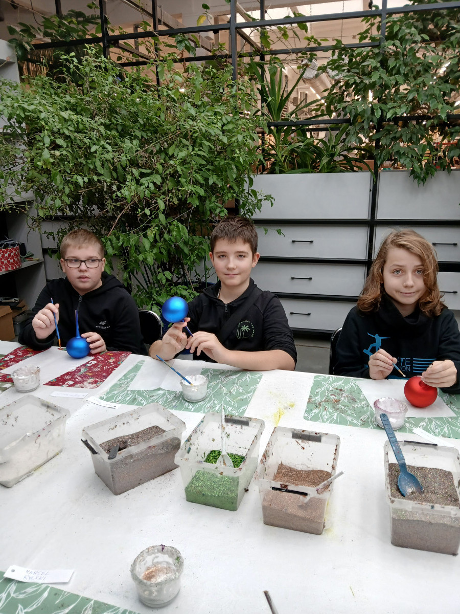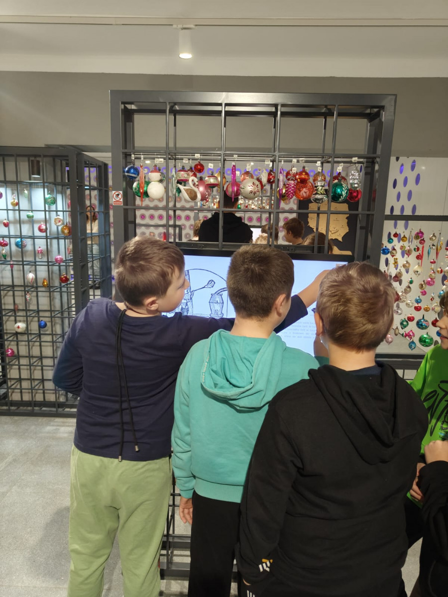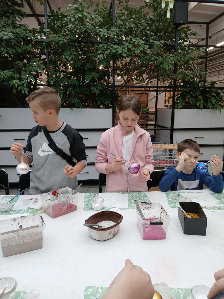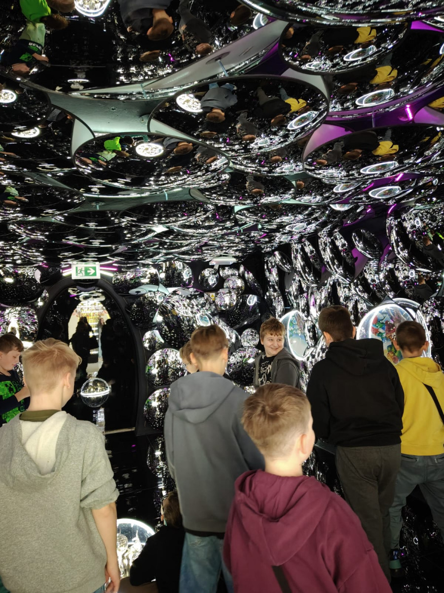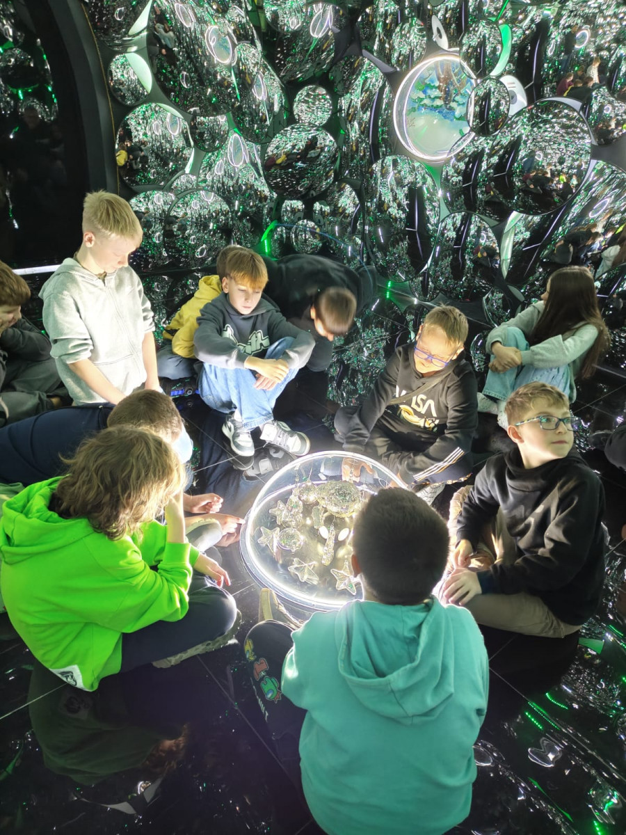 Już od samego wejścia dzieci zostały wprowadzone w magiczną atmosferę – zwiedziły Żywe Muzeum Bombki, gdzie przeszły przez ścieżkę edukacyjną pokazującą historię szkła i proces produkcji bombek. W sali edukacyjnej podziwiały ozdoby z dawnych lat – niektóre z bombek pochodzą z ubiegłych dekad, co pokazało, jak zmieniały się wzory i techniki na przestrzeni czasu. Podczas zwiedzania poznali cały proces powstawania szklanych ozdób — od dmuchania gorącego szkła, przez srebrzenie, aż po malowanie i dekorowanie. Najbardziej wyczekiwanym momentem była część warsztatowa – każdy uczeń miał okazję własnoręcznie ozdobić bombkę pod opieką dekoratorki. To nie tylko świetna zabawa, ale również niepowtarzalna pamiątka, którą dzieci zabrały do domu. Podczas zwiedzania na uczniów czekała wyjątkowa niespodzianka: w jednej z sal muzeum dzieci przeniosły się do wnętrza bombki — dzięki efektom świetlnym i lustrzanym to doświadczenie było niemal jak wejście do innego świata. Wycieczka była wartościowym doświadczeniem: nie tylko pozwoliła na poznanie tradycyjnego rzemiosła, ale również rozbudziła kreatywność i wzbudziła podziw dla pracy rękodzielników. Wracaliśmy do szkoły z głowami pełnymi kolorowych pomysłów… i z bombkami w plecakach 😊