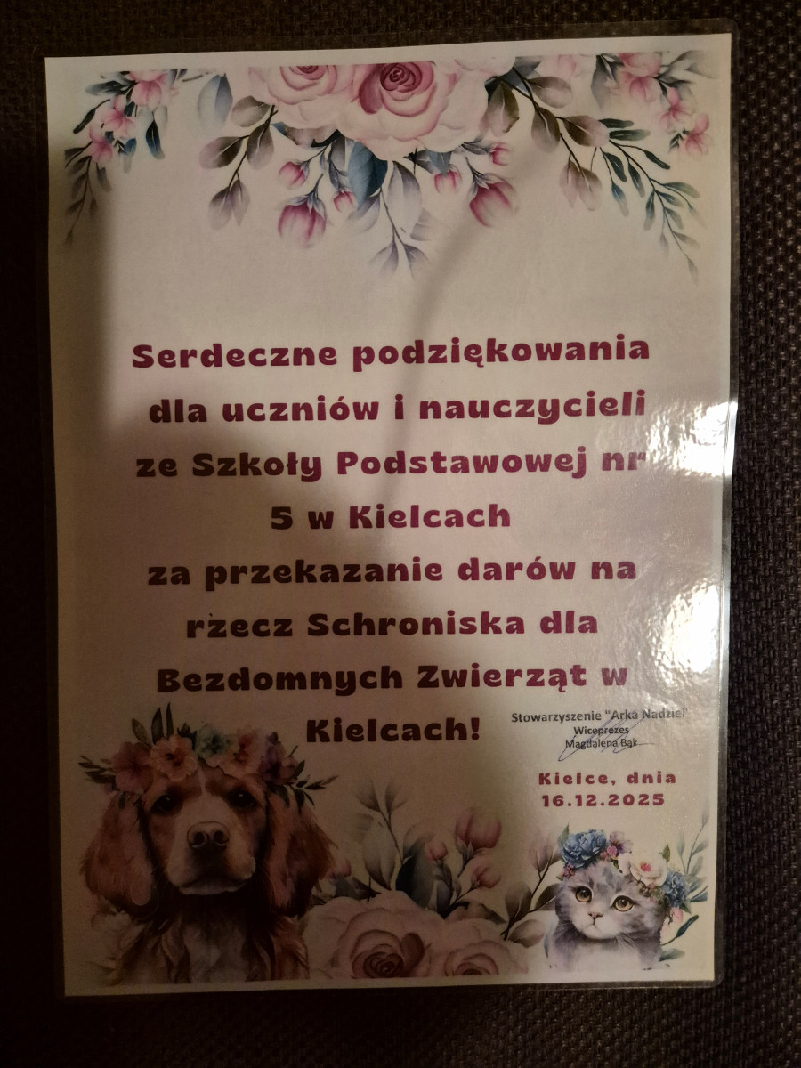 Zebrane dary zostały przekazane do schroniska 16 grudnia. Szkoła otrzymała podziękowanie od schroniska, jednak największą radością była dla nas sama możliwość niesienia pomocy bezdomnym zwierzętom oraz uwrażliwienie uczniów na ich los. Podczas przekazania karmy uczniowie mieli okazję poznać zasady funkcjonowania schroniska i pracę wolontariuszy oraz dowiedzieć się, jak ważne jest odpowiedzialne podejście do opieki nad zwierzętami.