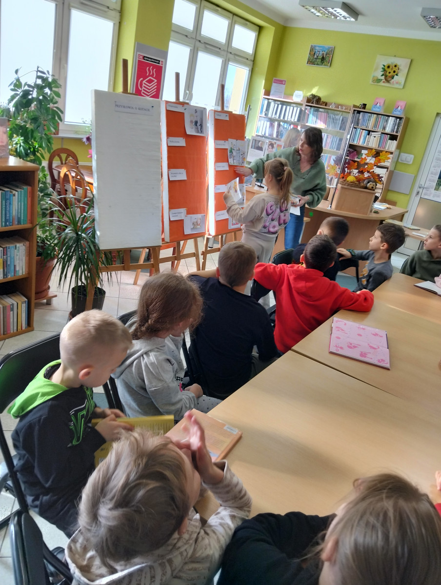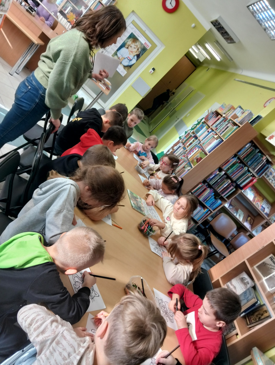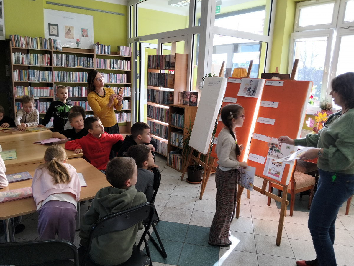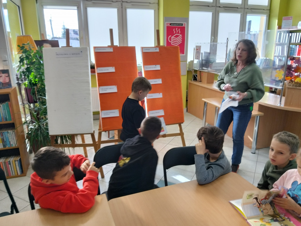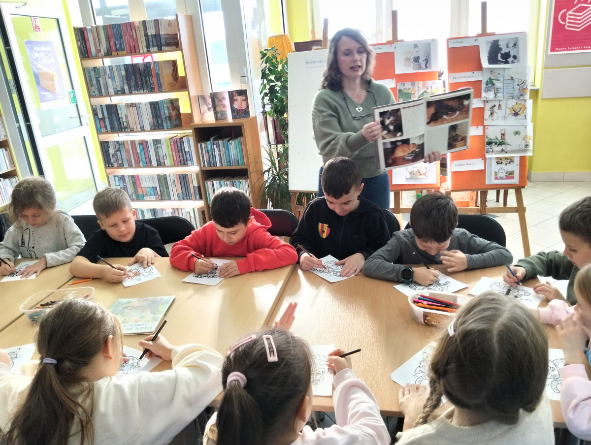 Uczniowie klasy 1C wybrali się do Miejskiej Bibliotece Publicznej przy ul. Górniczej, aby znów spotkać się z „Cukierkiem”. Chodzi oczywiście o lekturę „Cukierku, ty łobuzie!”, którą ostatnio omawiali podczas zajęć w klasie. Tak, jak każde dziecko nie może oprzeć się cukierkom, tak nasi uczniowie nie mogą rozstać się z przezabawnym bohaterem „Cukrzycom”, czyli Cukierkiem – figlarnym kotem łobuzem. Aby zachęcić dzieci do kreatywnej „zabawy” z lekturą, uczniowie doświadczyli wielu form działań, które przygotowała p. M. Kuzia. Łamigłówki, krzyżówki, grupowy Quiz i na co wszyscy czekali – wykonanie przestrzennego Kotka… Uczniowie dowiedzieli się także wielce ciekawostek o tych milusińskich, jak również przekonali się o obowiązkach i odpowiedzialności, jakie czekają na każdego właściciela… Pierwszoklasiści chętnie wypowiadali się o swoich doświadczeniach, dotyczących posiadania zwierzątka.