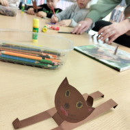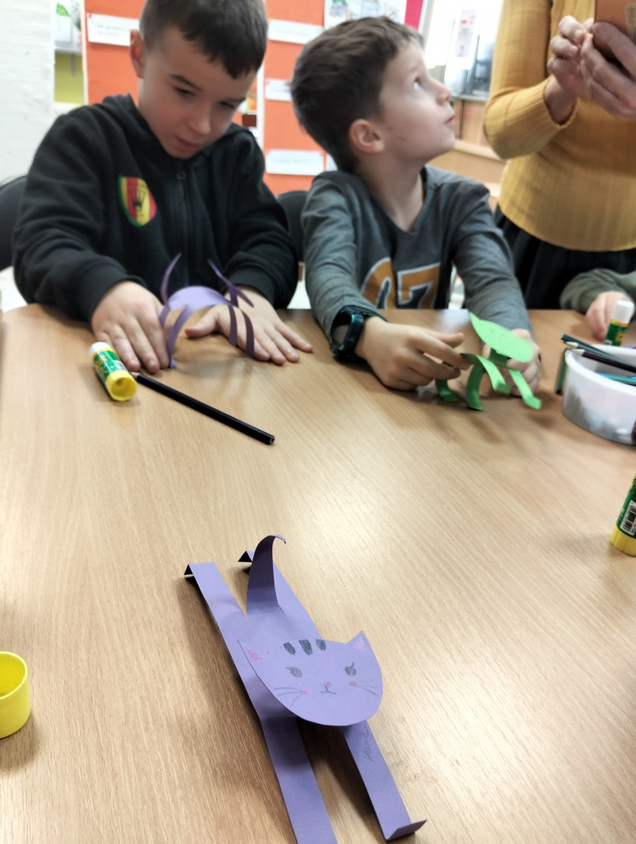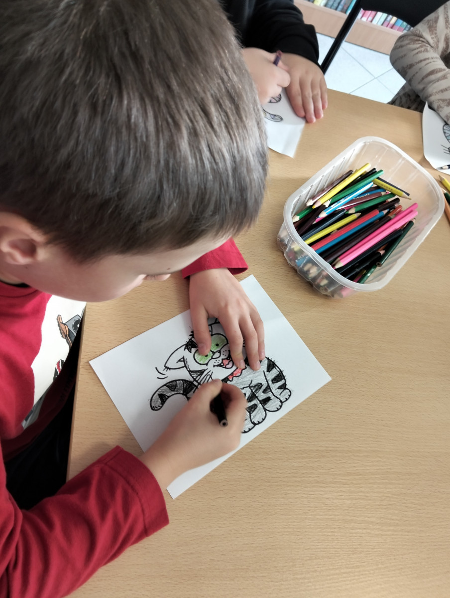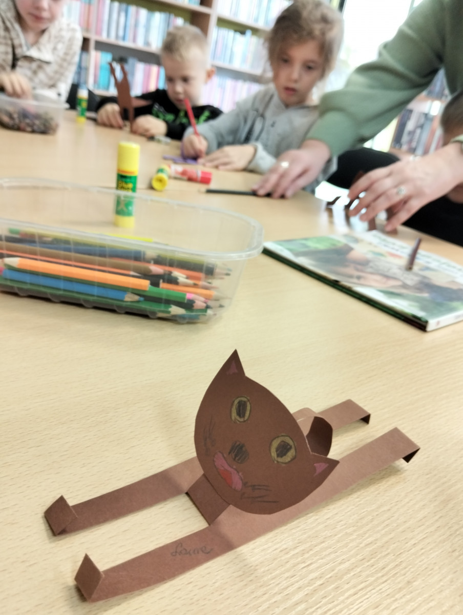 Dzieci były bardzo szczęśliwe, jak dowiedziały się, że p. W. Cichoń napisał jeszcze kilka części w których zdradził kolejne przygody Cukierka. To zachęciło uczniów do odwiedzenia biblioteki kolejny raz – każdy uczestnik warsztatów otrzymał kolorowe zakładki - główki kotków z godzinami pracy wypożyczalni.