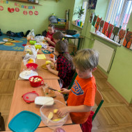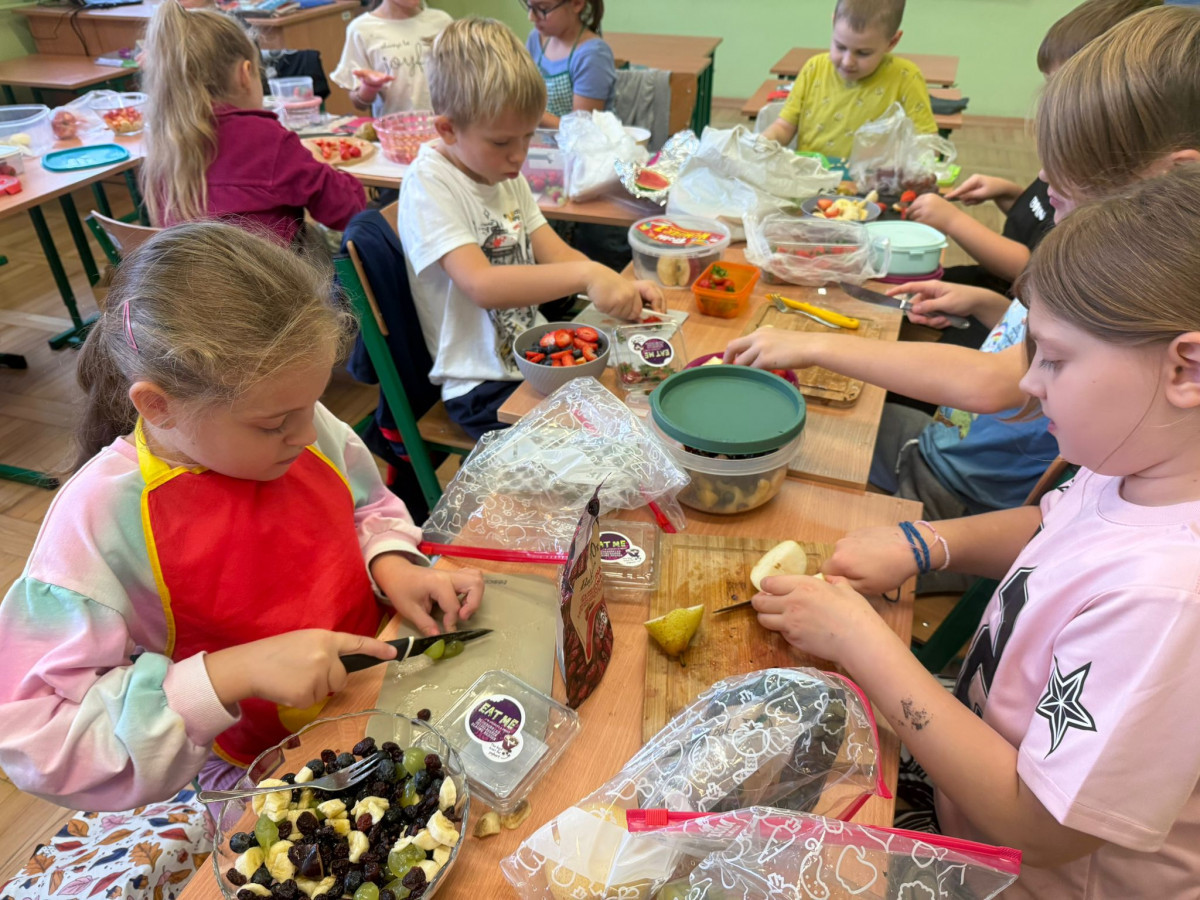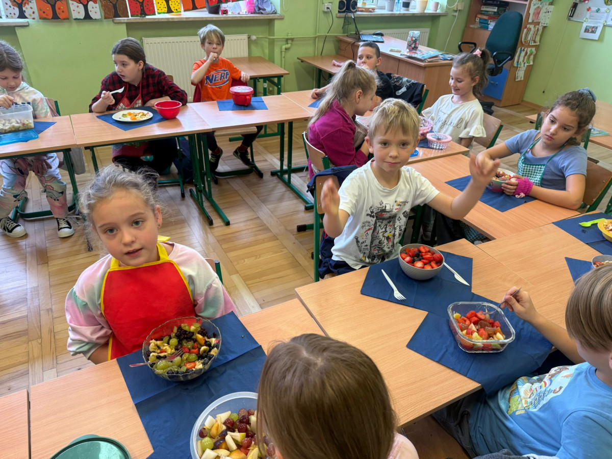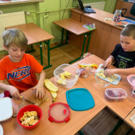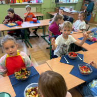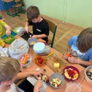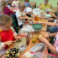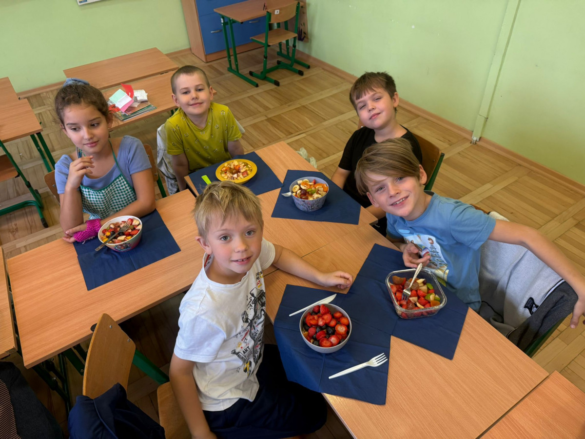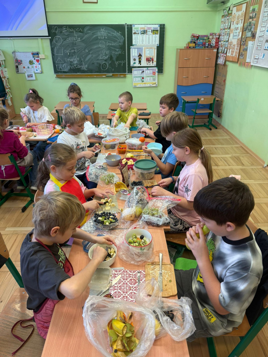 Wspólne krojenie, przygotowywanie i degustacja sprawiły wszystkim wiele radości. Dzieci przypomniały sobie jak ważne jest zdrowe odżywianie, higiena podczas posiłków i wspólna praca.
