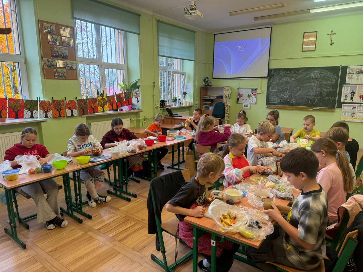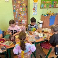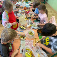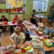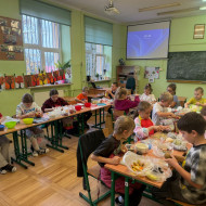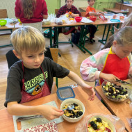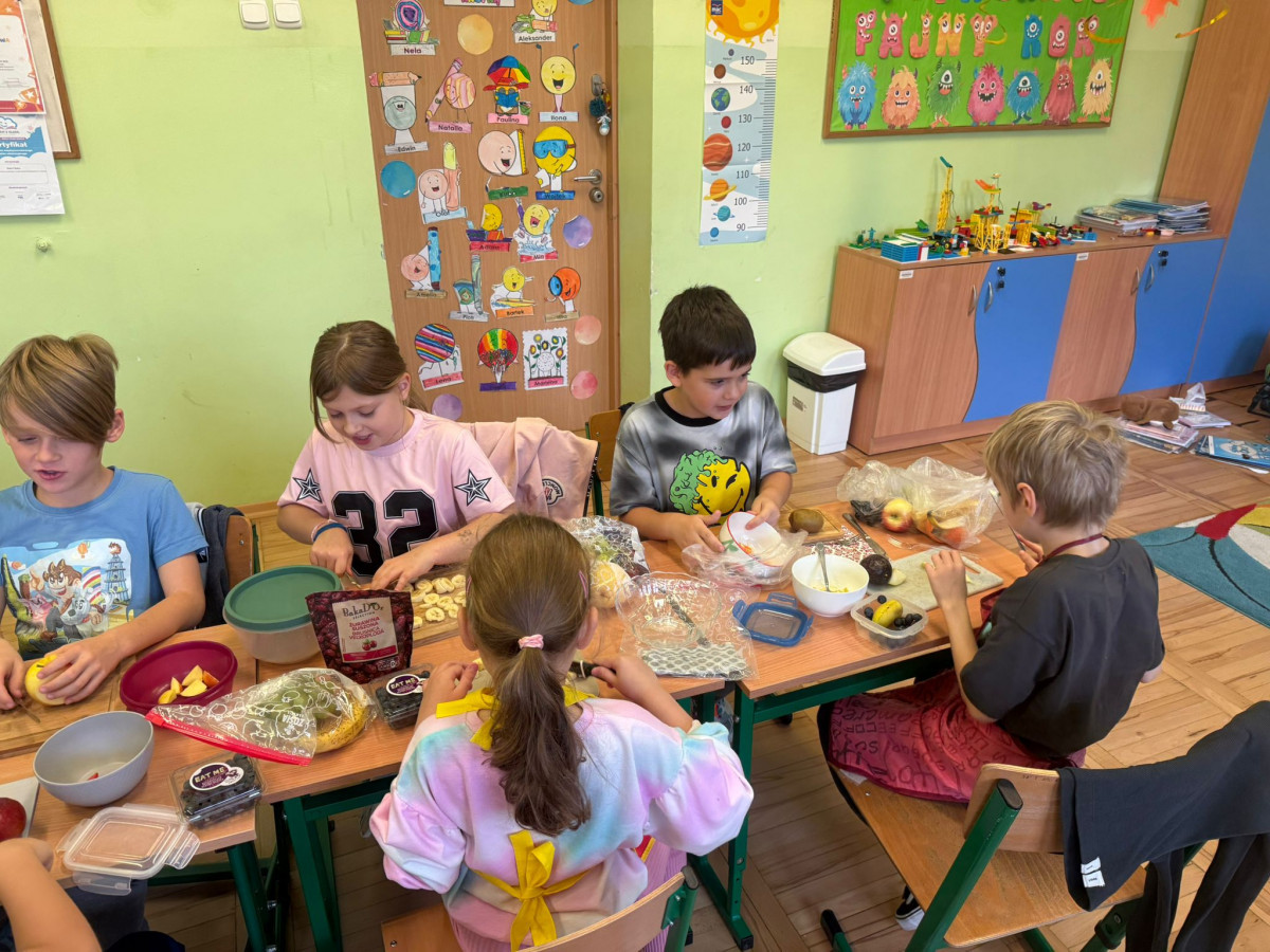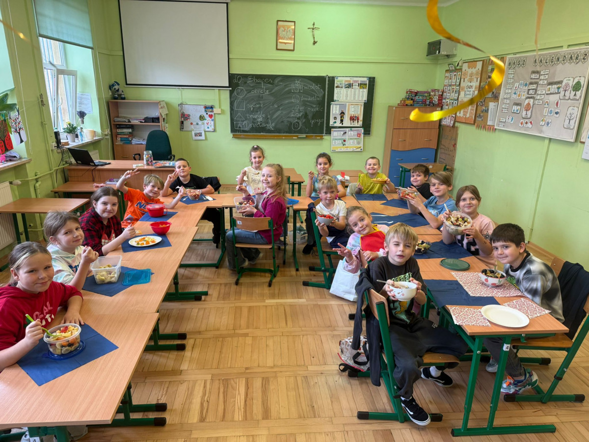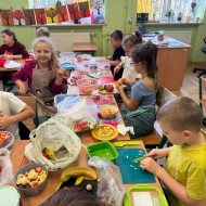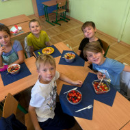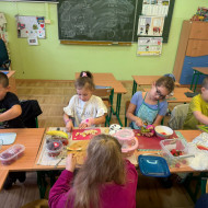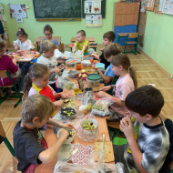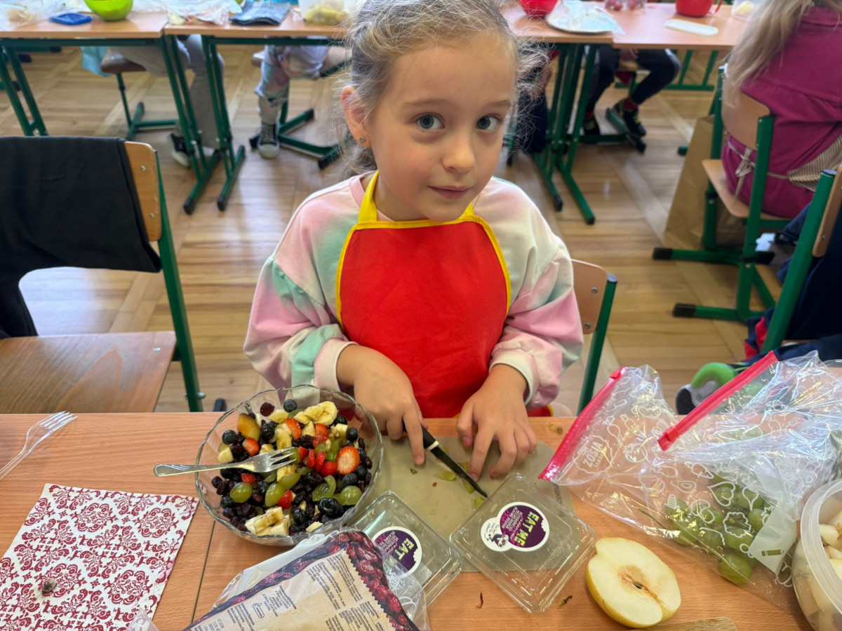Wspólne krojenie, przygotowywanie i degustacja sprawiły wszystkim wiele radości. Dzieci przypomniały sobie jak ważne jest zdrowe odżywianie, higiena podczas posiłków i wspólna praca.