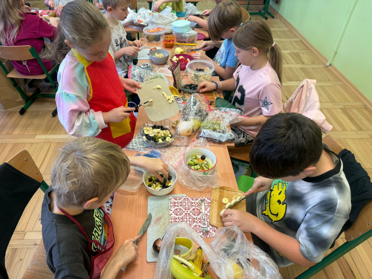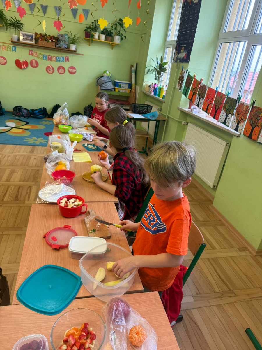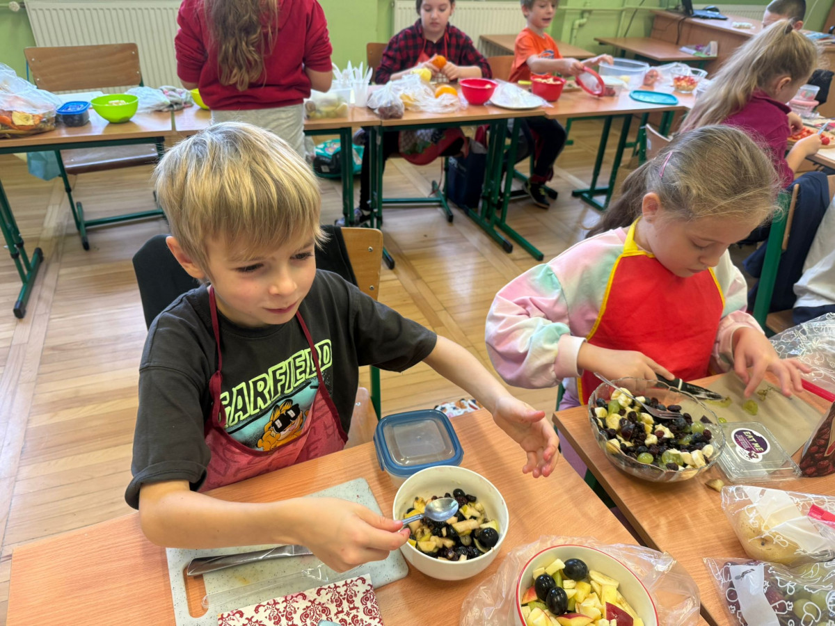 Uczniowie klasy 2a przygotowali pyszną sałatkę owocową. 🍎🍇🍓🫐🍉🍊🍌🍐🍑