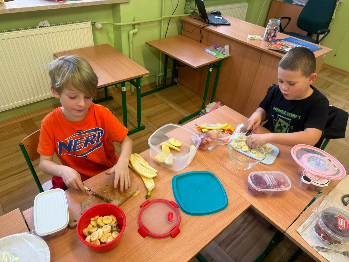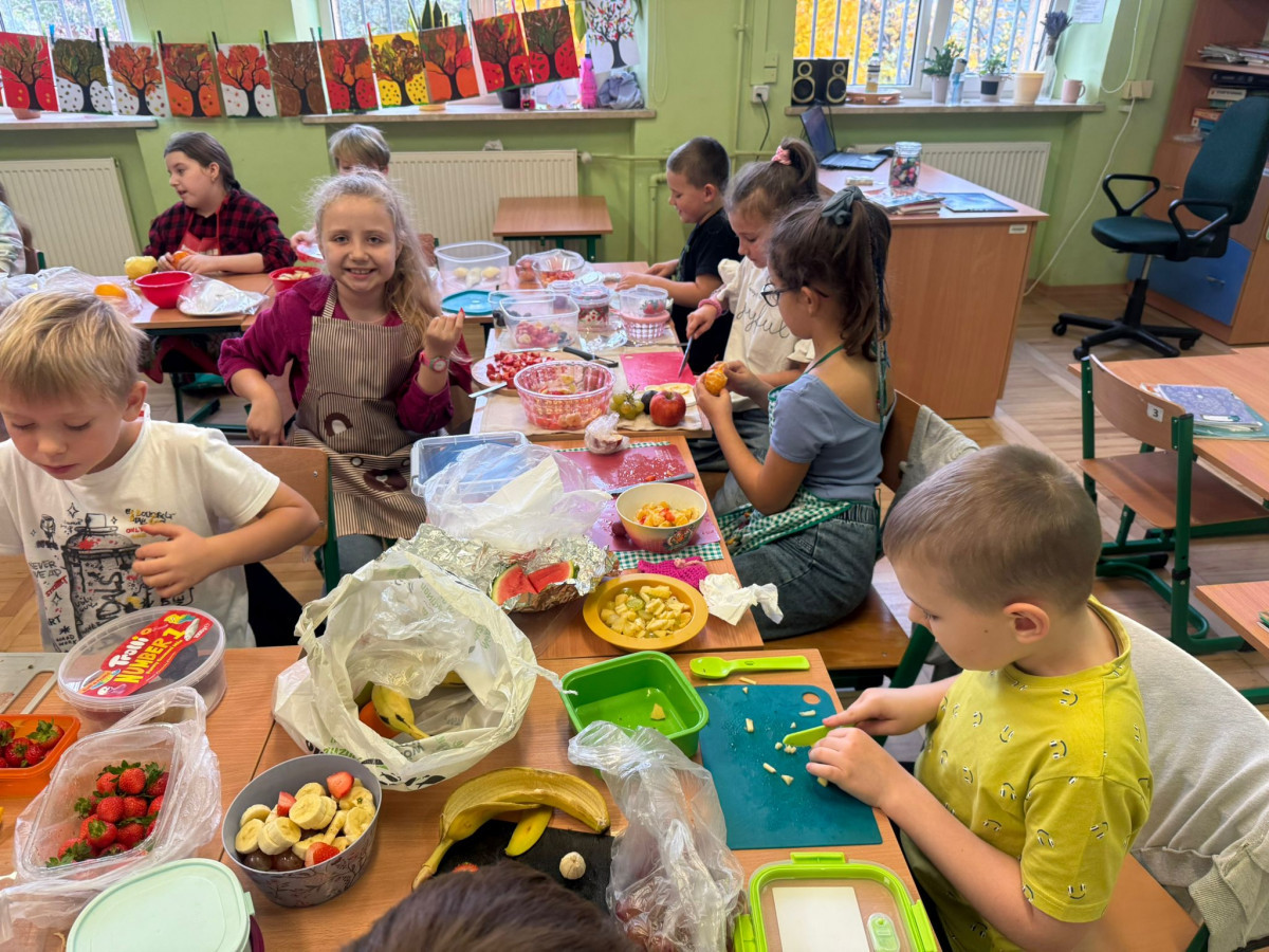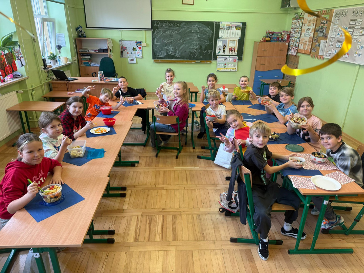 Uczniowie klasy 2a przygotowali pyszną sałatkę owocową. 🍎🍇🍓🫐🍉🍊🍌🍐🍑