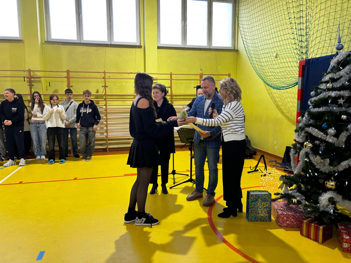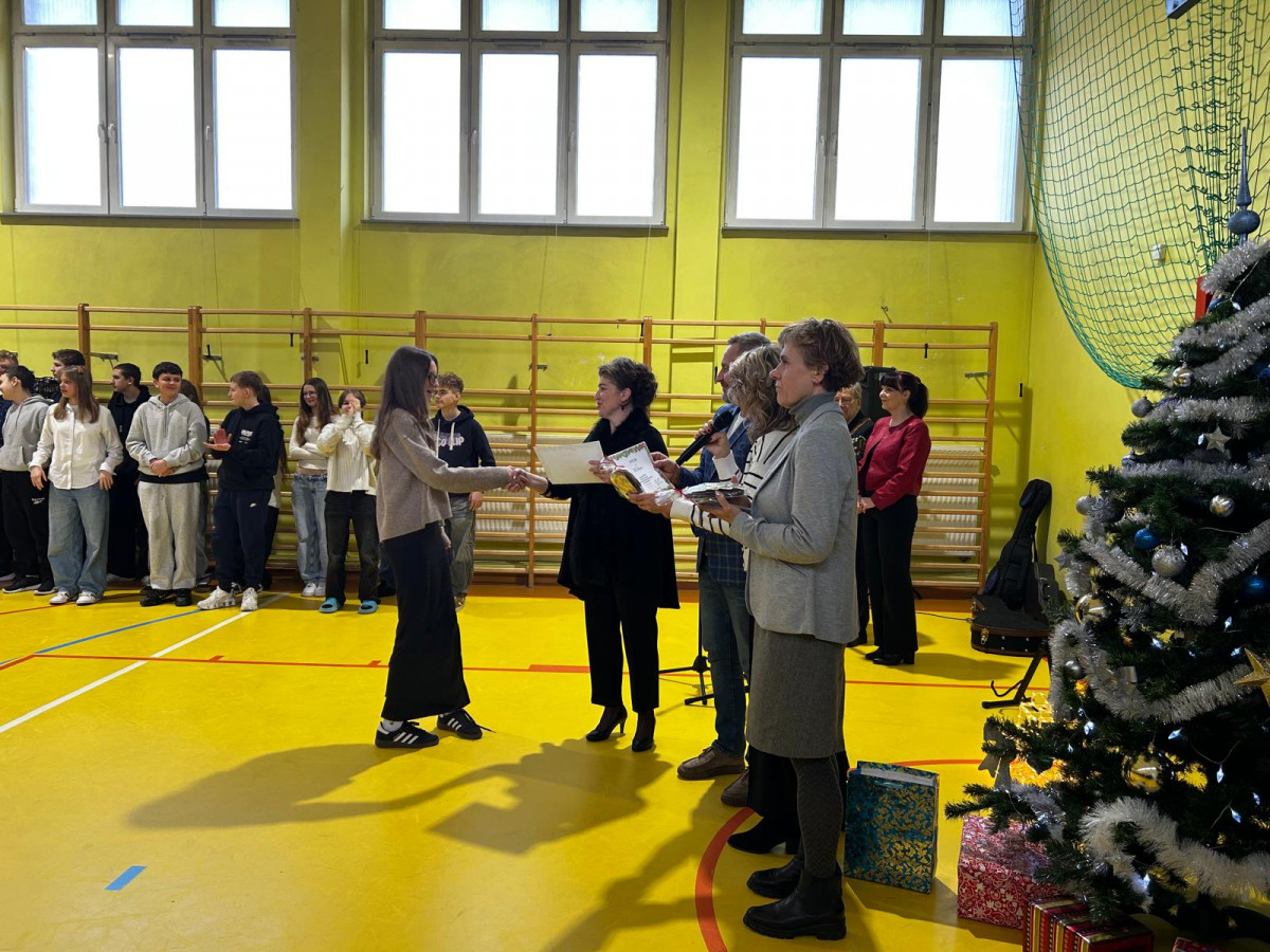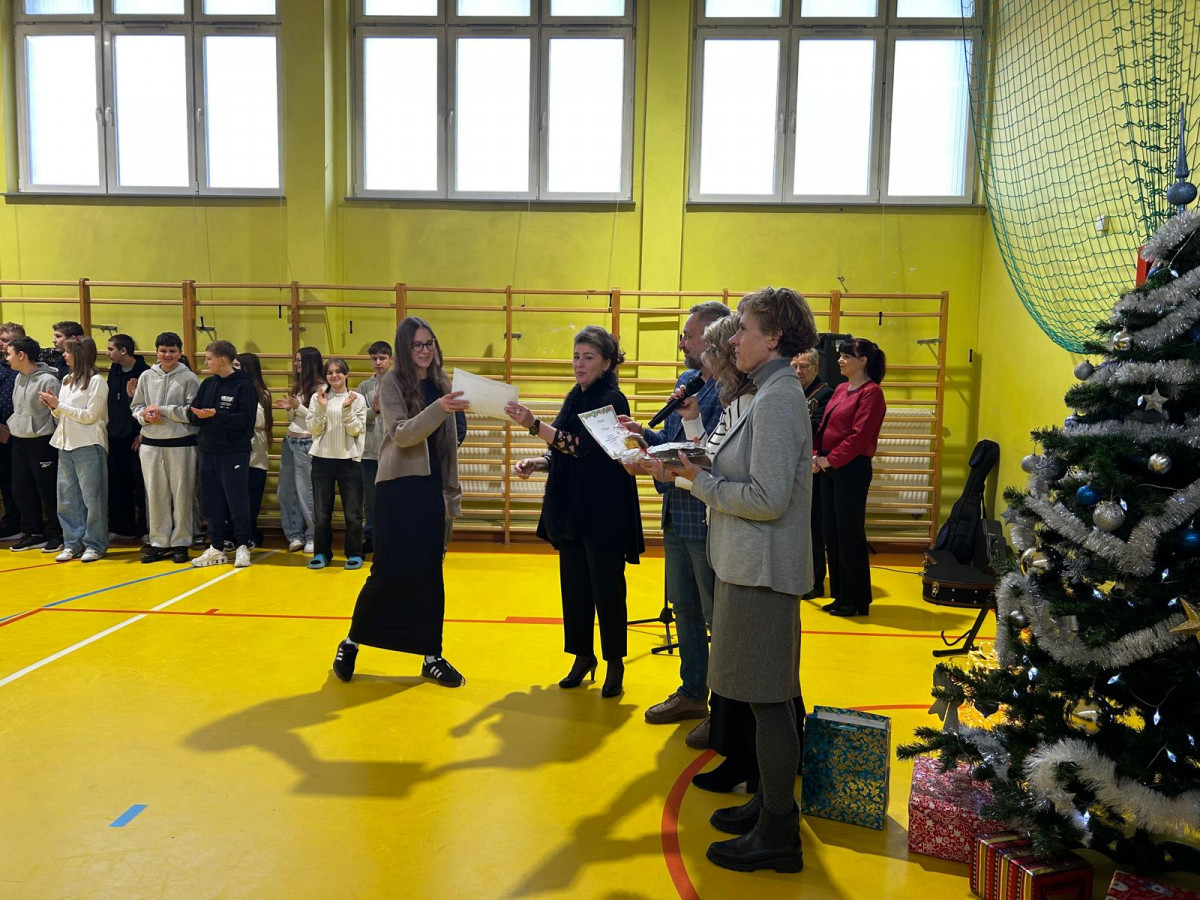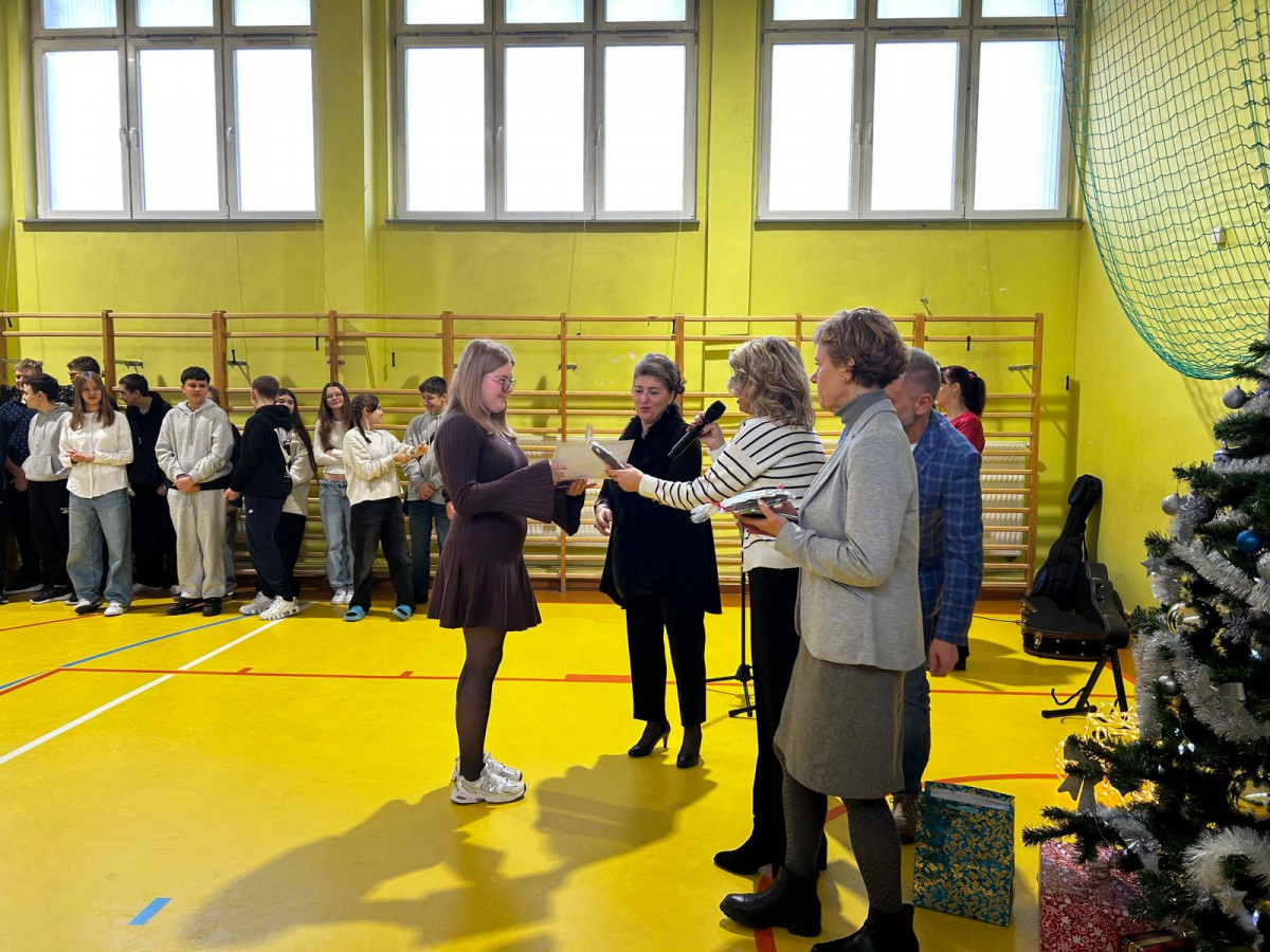 On December 19, in building B in the school gymnasium, our foreign language teachers and the school management had the honour to present diplomas and awards for the most beautiful Christmas card to students from grades 5-8.