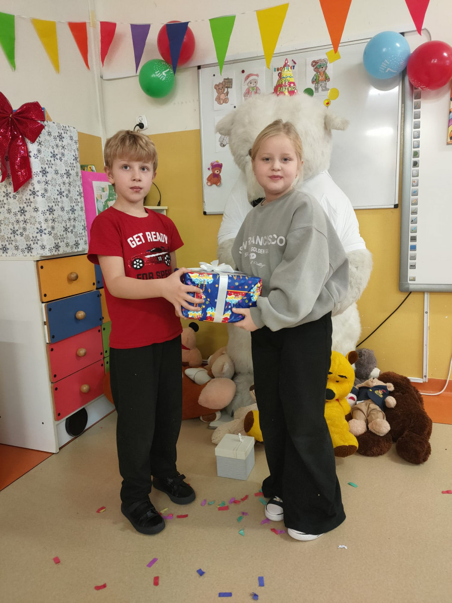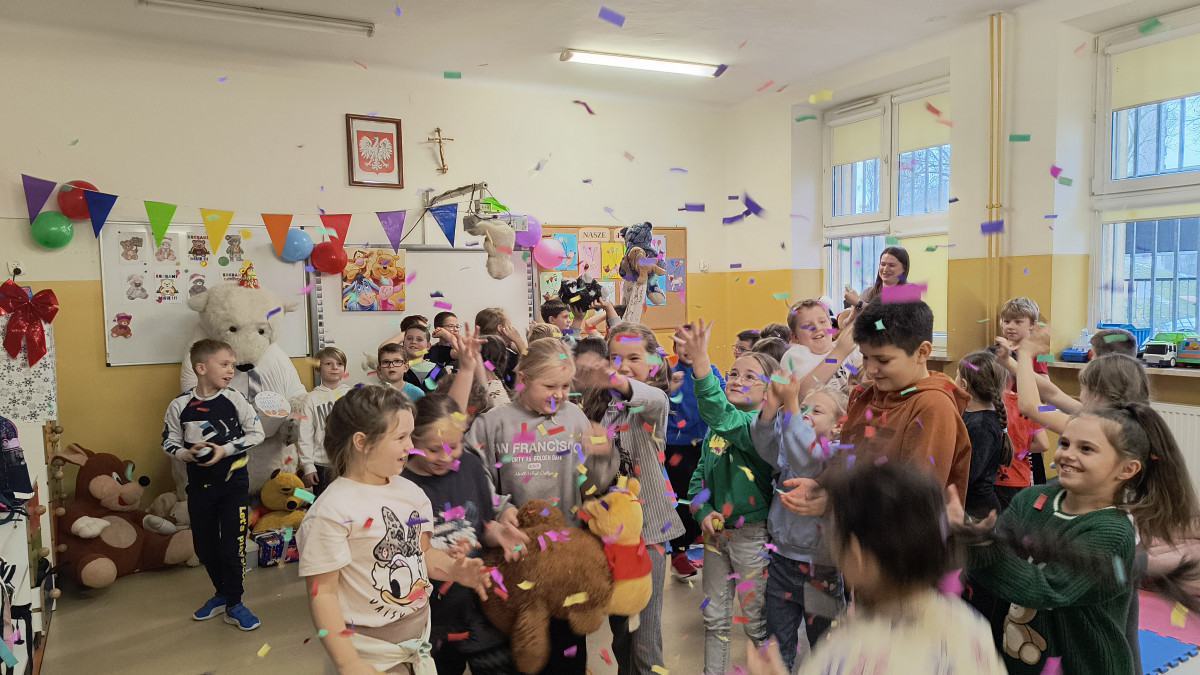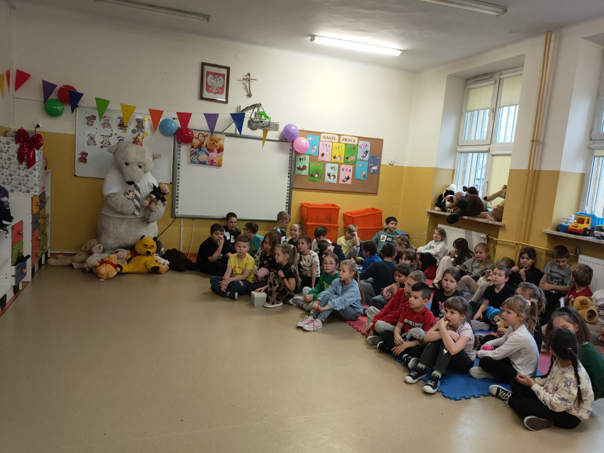 Dziś w świetlicy obchodziliśmy wyjątkowe święto – siódmą rocznicę urodzin naszego szkolnego przyjaciela – Misia Piątka! Uczniowie zaśpiewali Miśkowi „Sto lat”, wręczyli tort, prezent oraz własnoręcznie przygotowane kartki urodzinowe. Następnie rozpoczęło się świętowanie. Jak na urodziny przystało nie mogło obejść się bez różnych zabaw m.in. taniec z balonami, quiz o misiach, rysowanie misia z zamkniętymi oczami oraz przypinanie mu muszki. Dziękujemy wszystkim uczniom za wspólną zabawę i cieszymy się, że Miś Piątek ma w szkole tylu przyjaciół.