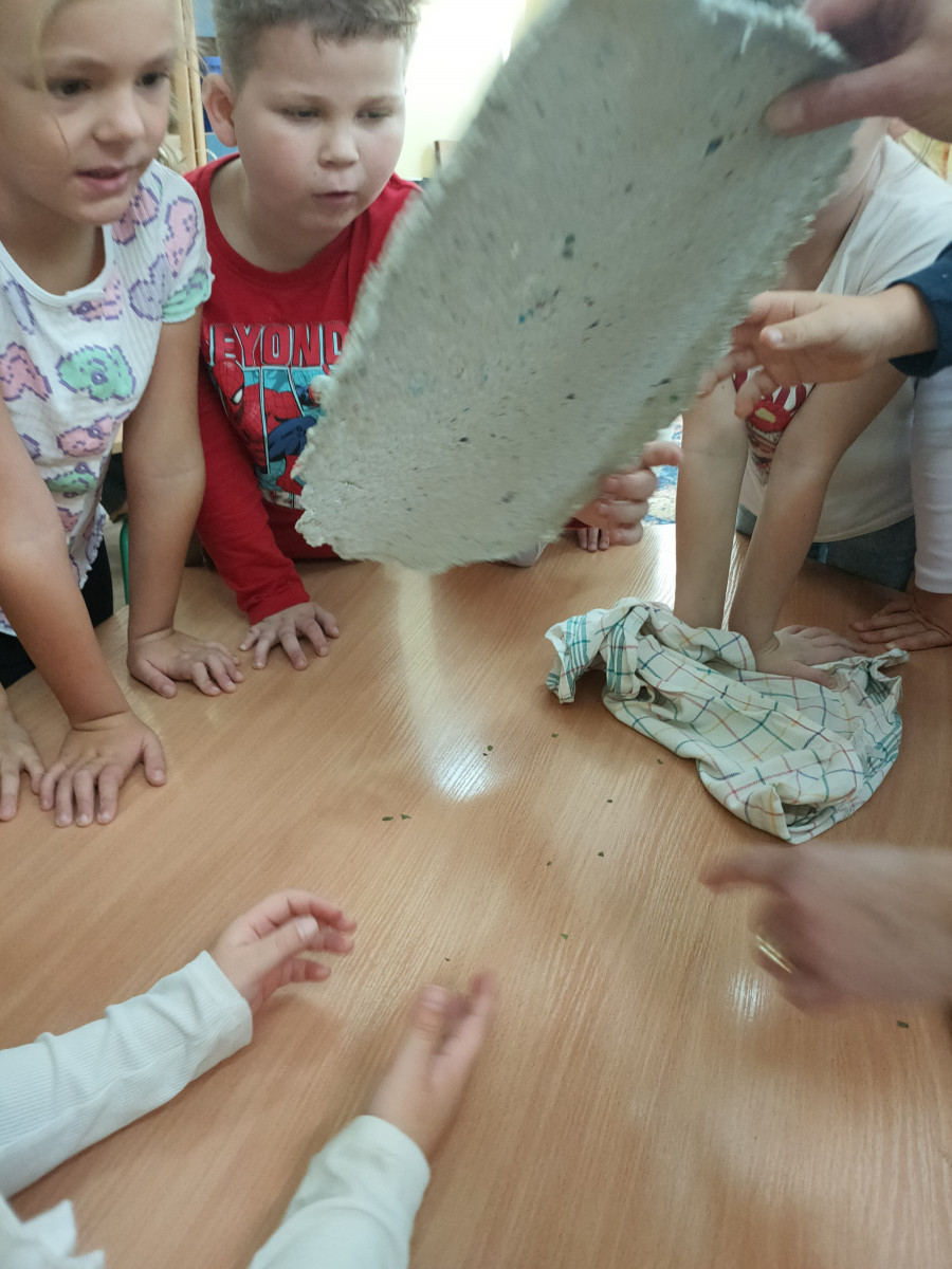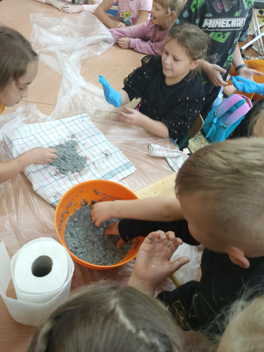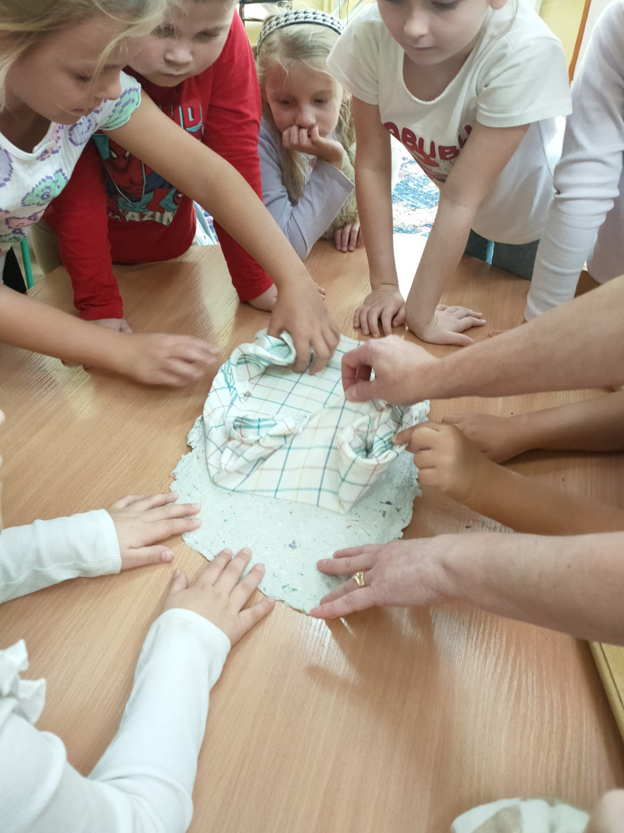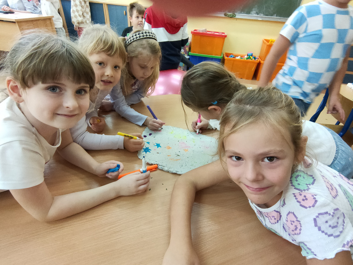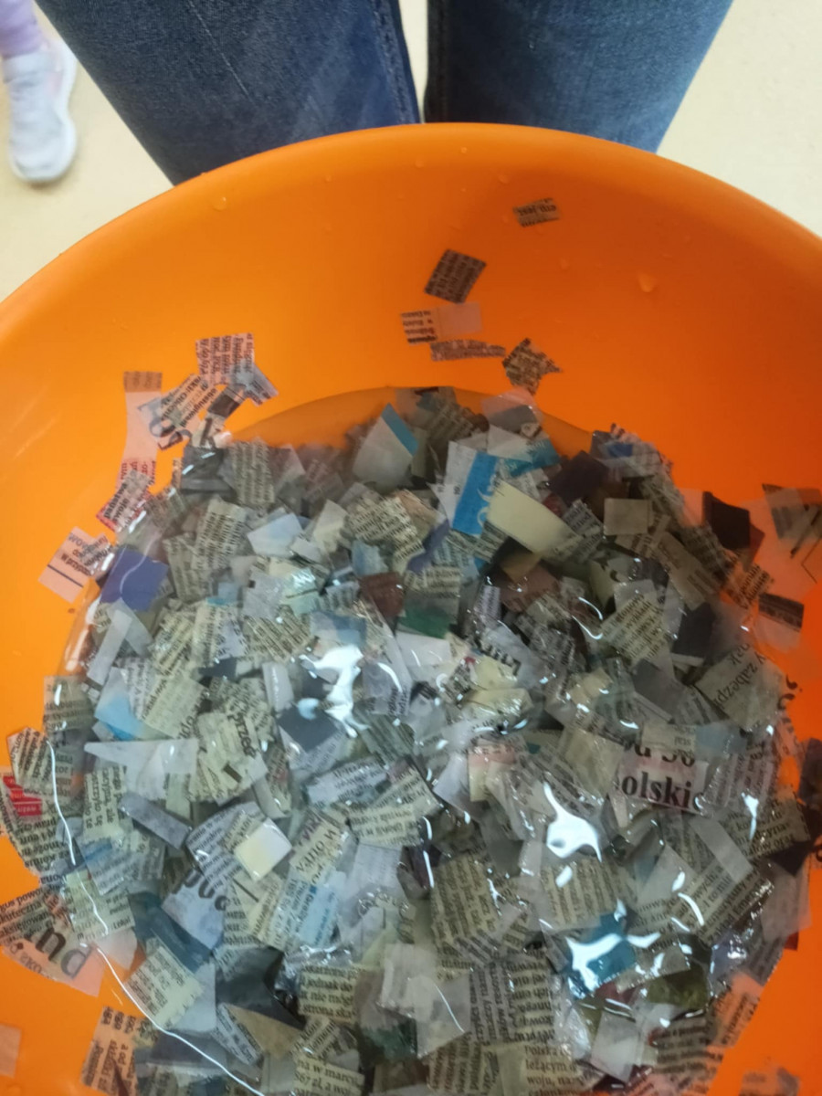 Ostatnio dzieci, niczym odkrywcy z Chin sprzed 2000 lat, wyprodukowali własnoręcznie papier w ramach zajęć pt. “Papier made in China”. Praca wymagała precyzji, cierpliwości a co za tym idzie sporo czasu. Przygotowanie papieru (a właściwie jak się później okazało tektury) to jedna sprawa, a kolejna to porządne jego wysuszenie. Dopiero po kilku dniach uczniowie zabrali się do oceny swojej pracy testując własne dzieło pod względem wytrzymałości, możliwości zapisu i pokrywania rysunkiem. Mimo, że zamiast kartki papieru ostatecznie powstała tektura, to obiektywnie rzecz ujmując zadanie wykonano wzorowo.