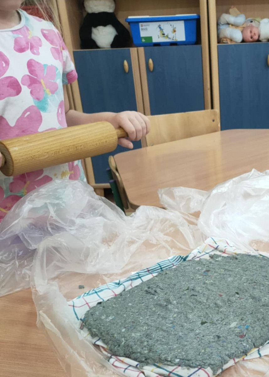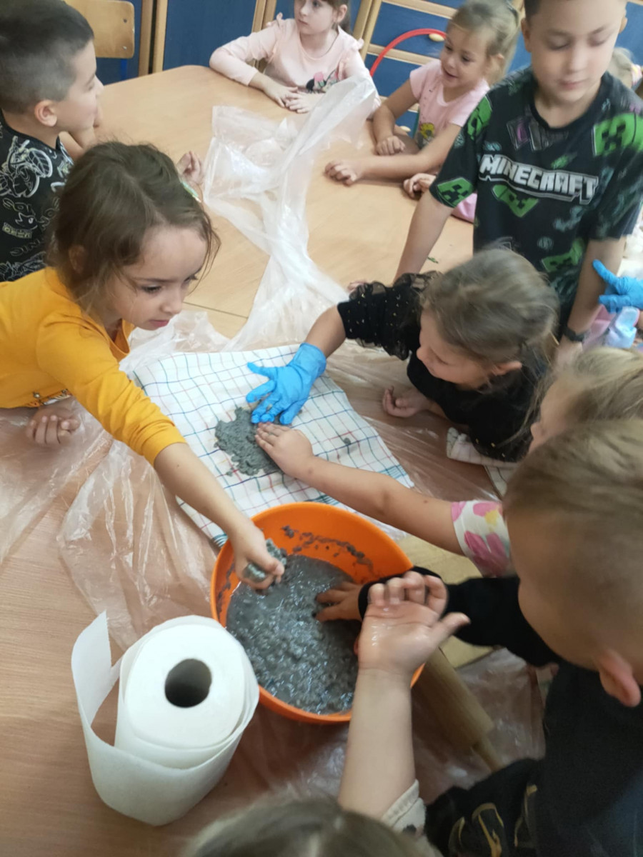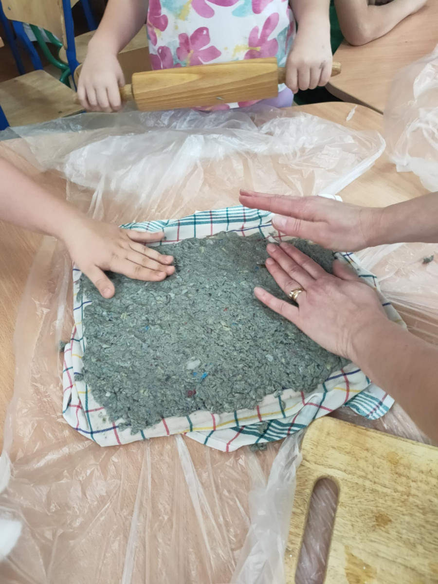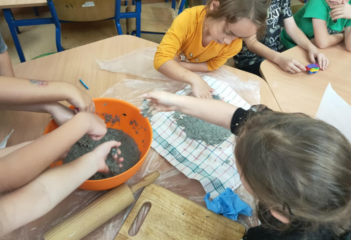 Ostatnio dzieci, niczym odkrywcy z Chin sprzed 2000 lat, wyprodukowali własnoręcznie papier w ramach zajęć pt. “Papier made in China”. Praca wymagała precyzji, cierpliwości a co za tym idzie sporo czasu. Przygotowanie papieru (a właściwie jak się później okazało tektury) to jedna sprawa, a kolejna to porządne jego wysuszenie. Dopiero po kilku dniach uczniowie zabrali się do oceny swojej pracy testując własne dzieło pod względem wytrzymałości, możliwości zapisu i pokrywania rysunkiem. Mimo, że zamiast kartki papieru ostatecznie powstała tektura, to obiektywnie rzecz ujmując zadanie wykonano wzorowo.