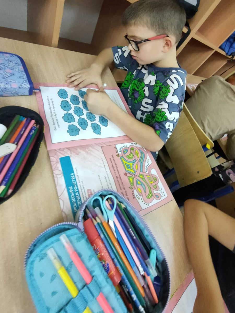 W ostatnim czasie świetlica szkolna brała udział w akcji konkursowej organizowanej przez Urząd Miasta Kielce pod nazwą “Chroń swoje zdrowie- oddychaj czystym powietrzem”. Przeprowadzono warsztaty oparte na materiałach dostarczonych przez organizatora. Na podstawie eksperymentów uczniowie próbowali odpowiedzieć na pytanie jak wygląda powietrze i dlaczego nie można nadmuchać balonika wewnątrz butelki. Dowiedzieli się co to jest smog, kiedy powstaje i jak może wpływać na zdrowie wszystkich żywych organizmów. Wspólnie zastanawiali się jak można zapobiegać zanieczyszczeniom powietrza. A na koniec dzieci dowiedziały się o istnieniu raportu smogowego, w którym na bieżąco aktualizowane są dane dotyczące stanu jakości powietrza.
