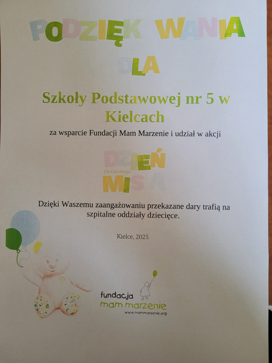 W związku z Dniem Pluszowego Misia Fundacja "Mam marzenie" organizuje każdego roku zbiórkę pluszaków, zabawek i artykułów papierniczych dla podopiecznych oddziałów onkologicznych w szpitalach dziecięcych. Dzieci z naszej szkoły, przy ogromnym wsparciu Rodziców,  z autentyczną radością i empatią podeszły do zadania i niezwłocznie wzięły udział w zbiórce. I choć czasu było niewiele, zebrano naprawdę sporą ilość prezentów dla małych pacjentów.